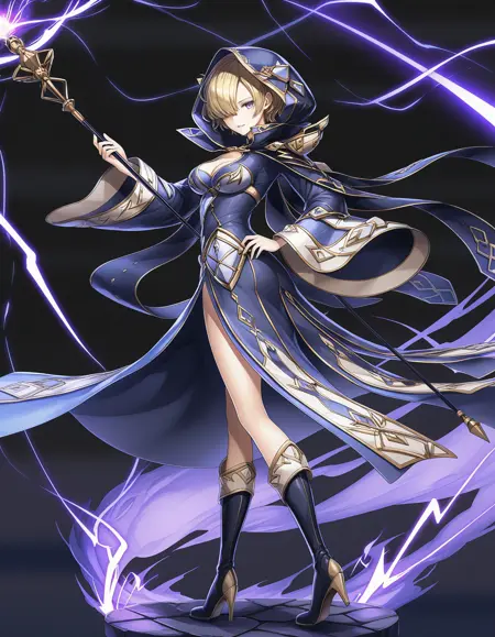 eclair_Unitia, blonde hair, short hair, hair over one eye, purple eyes, hood, blue dress, cleavage, wide sleeves