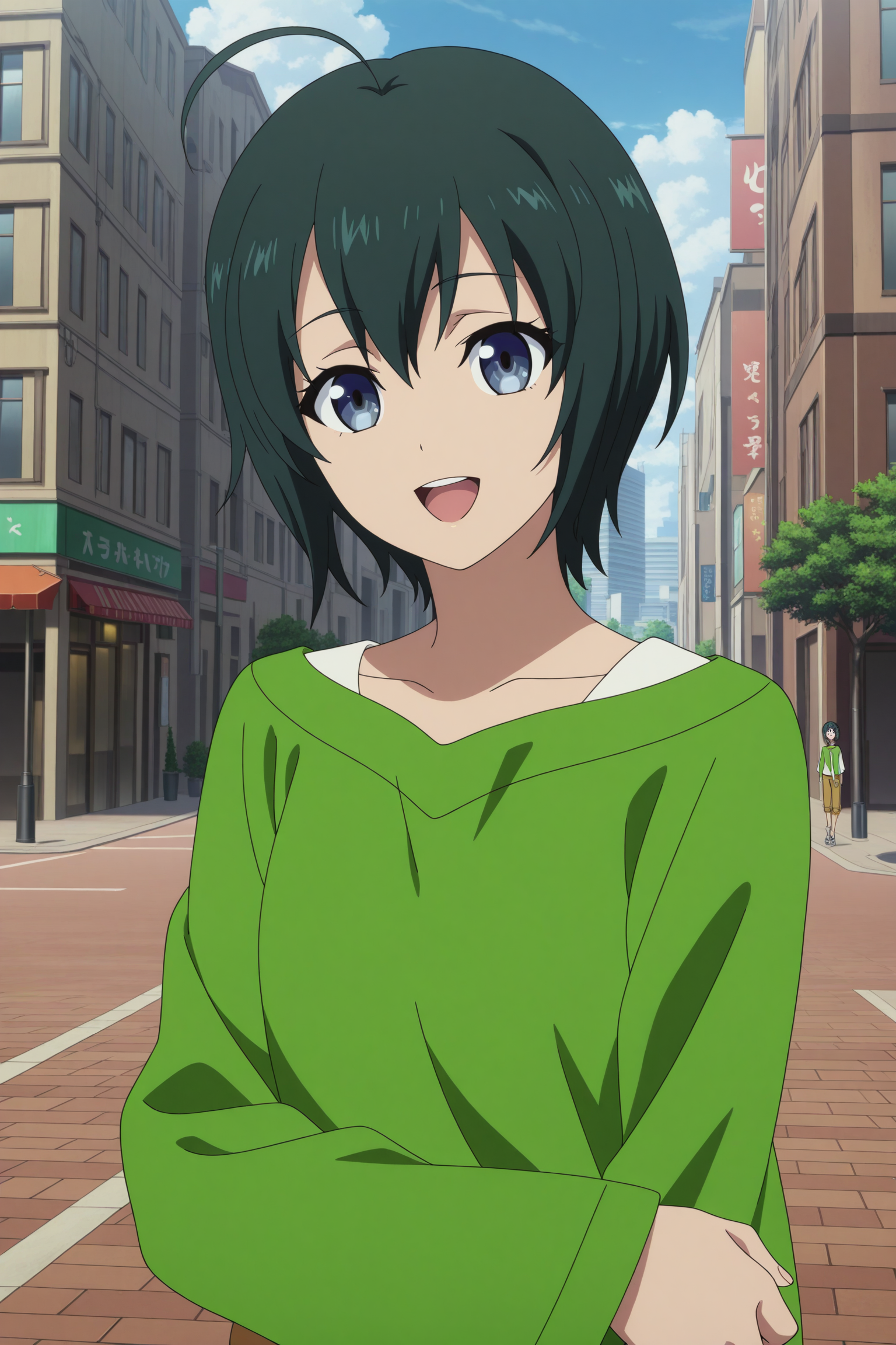 toudou misa, short hair, green hair, ahoge, blue eyes, three-quarter sleeves, green shirt, white shirt, back ribbon, brown pants, capri pants, grey footwear