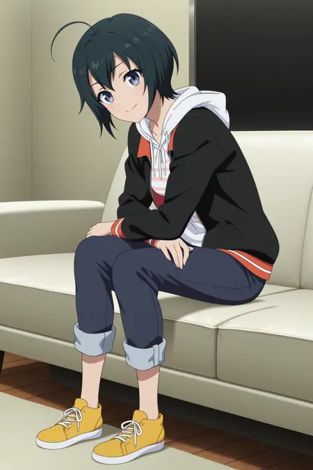 toudou misa, short hair, green hair, ahoge, blue eyes, long sleeves, jackets over hoodie, black jacket, white hoodie, striped hoodie, blue pants, pants rolled up, yellow footwear, sneakers
