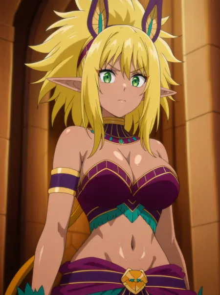 提示词:1girl,单人,绿色眼睛,尖耳朵,金发,乳房,深色皮肤,乳沟,肚脐,大乳房,裸露肩膀,短裙
