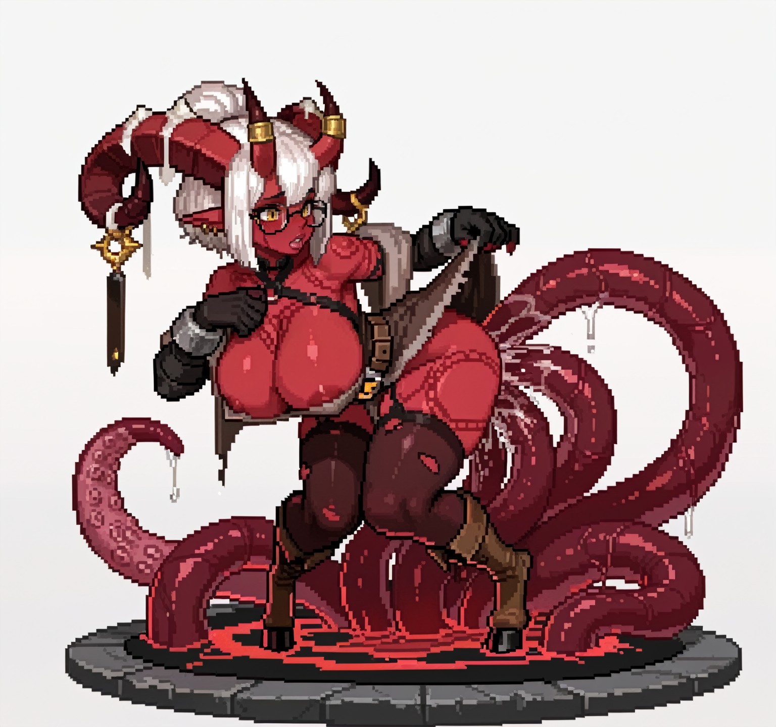 Main trigger is Literatidemoness. Other triggers: _candles on horns, curled horn_s, red skin, hooves, boots, spikes, fingerless gloves, black gloves, glasses, black-trimmed glasses, demon horns, leotard, bandages, short hair, lips, tail, bare shoulders, bracelet, demon tail, belt, bangle, thighhighs.