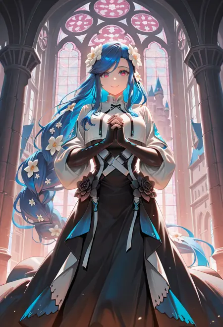 "GGSTRVDZY、青い髪、長い髪、髪の花、赤い目、白い短めのベスト、肘まで手袋、指なし手袋、黒いスカート、ドレスの花,"