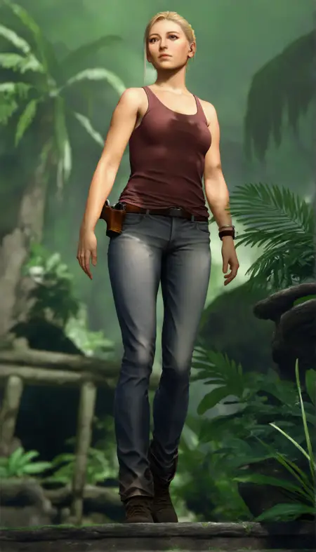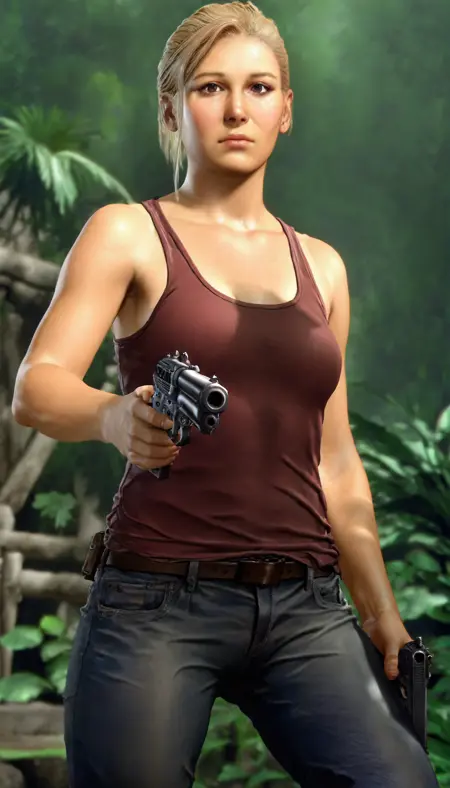 elenafisher, realistic, 1girl, solo, blonde hair, swept bangs, brown eyes, red tank top, dark grey jeans, brown belt, belt holster, silver bracelet on left hand, wristwatch on left hand, brown boots,
