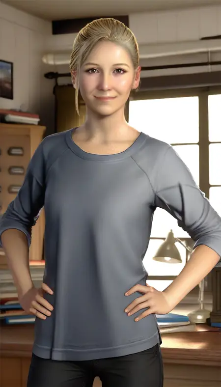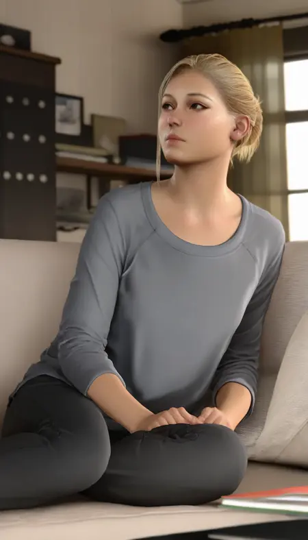 elenafisher, realistic, 1girl, solo, blonde hair, swept bangs, brown eyes, grey long sleeve shirt, black pants, silver bracelet on left hand, wristwatch on left hand, barefoot