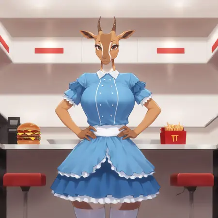 gazelle, anthro, 1girl, solo, dress, thighhighs, blue dress, furry, furry female, brown eyes