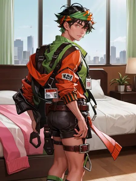服装:bandana,shirt,jacket,shorts,socks,shoes,belt,lanyard,weapon,thigh strap,id card