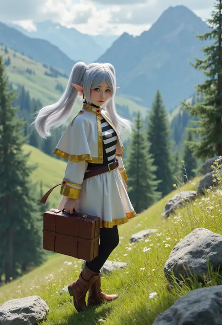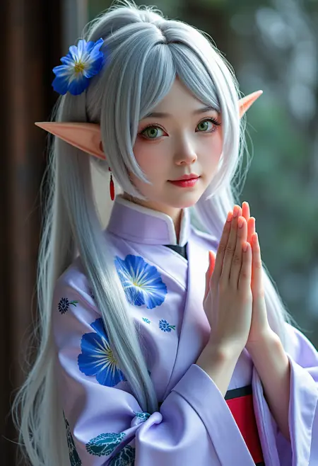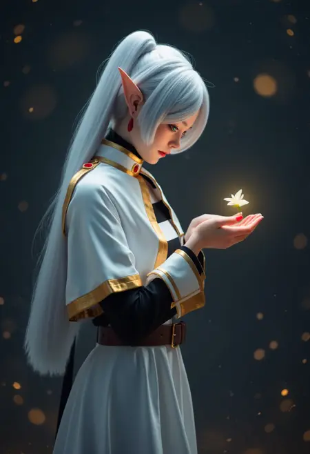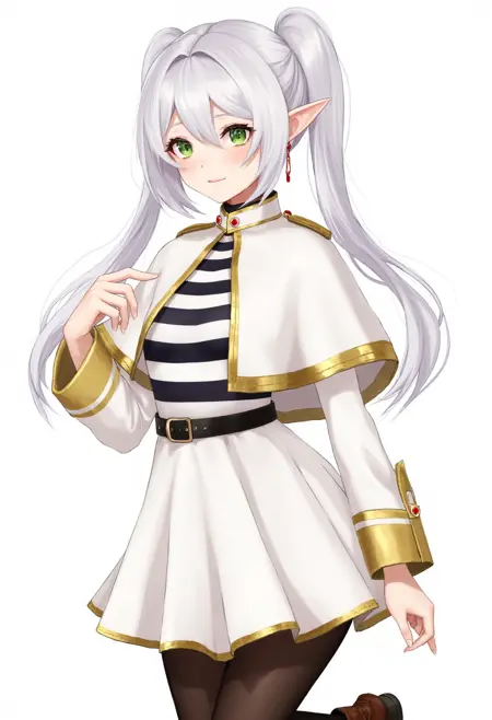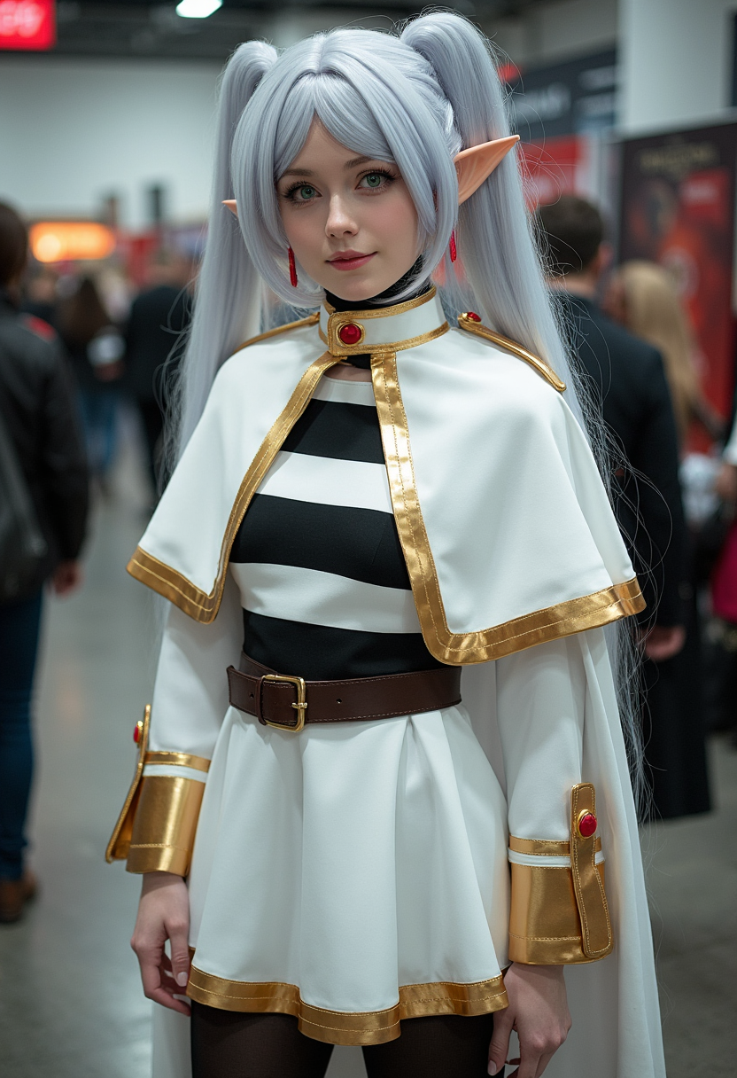 A photorealistic cosplaying F-r-i-e-r-e-n with twin tail silver hair and light green eyes. She is a nordic female. She is wearing a white and gold capelet over a black and white striped shirt with white sleeve. Her capelet has gold trimming, and red gems at the shoulders and wrists. She is wearing a white skirt with gold trim, black belt, opaque black tights, brown boots and red earings.