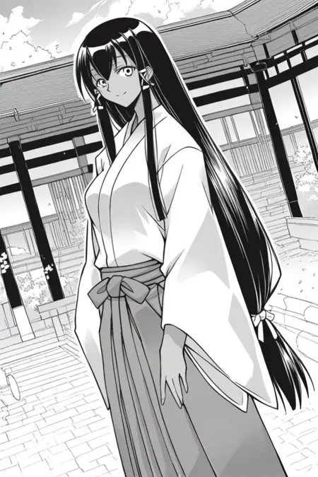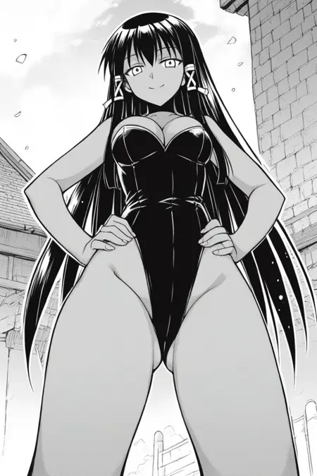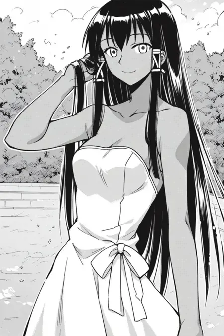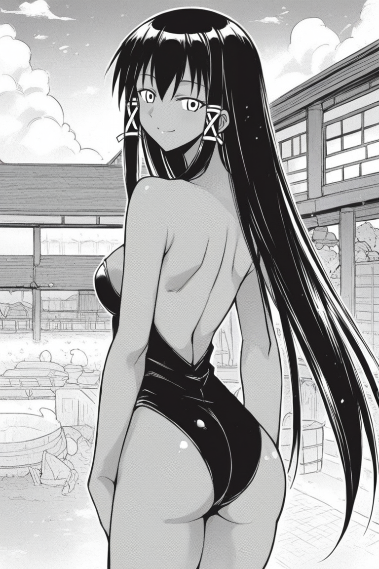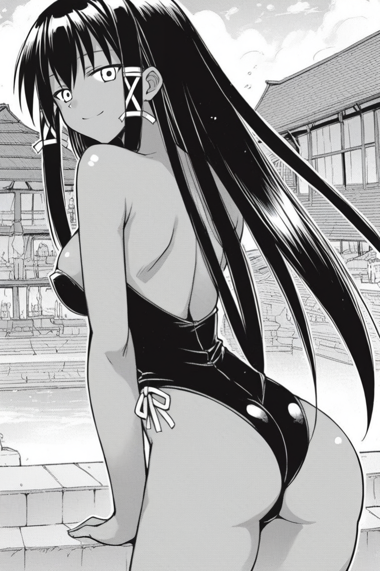 m4naMT, dark-skinned female, black hair, long hair, hair ribbon