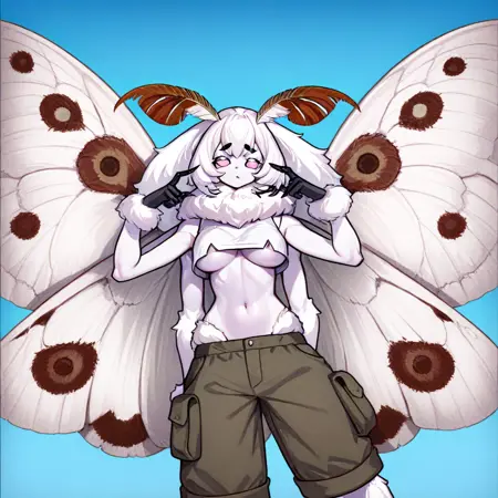 彼女の身体的特徴を追加のプロンプトとして使用すると、より効果的です。翼の斑点は白よりもピンクになる傾向がありますが、それでもよく似合います。また、目を描くことにやや苦戦する傾向があります。