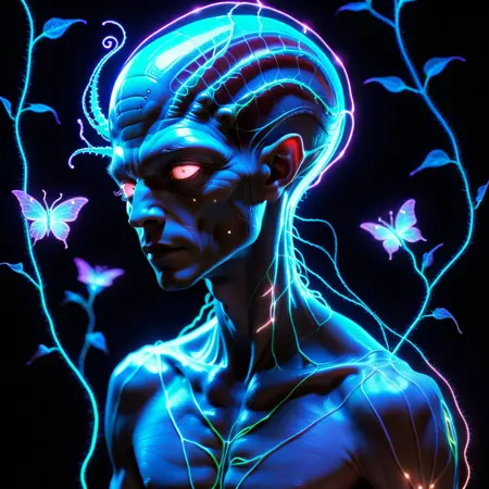 "Ethereal alien child with oversized glowing eyes, patchwork outfit with geometric patterns, bioluminescent skin, whimsical overgrown flora, surreal fantasy atmosphere, hand-drawn ink and watercolor textures, stylized fantasy with sci-fi elements."