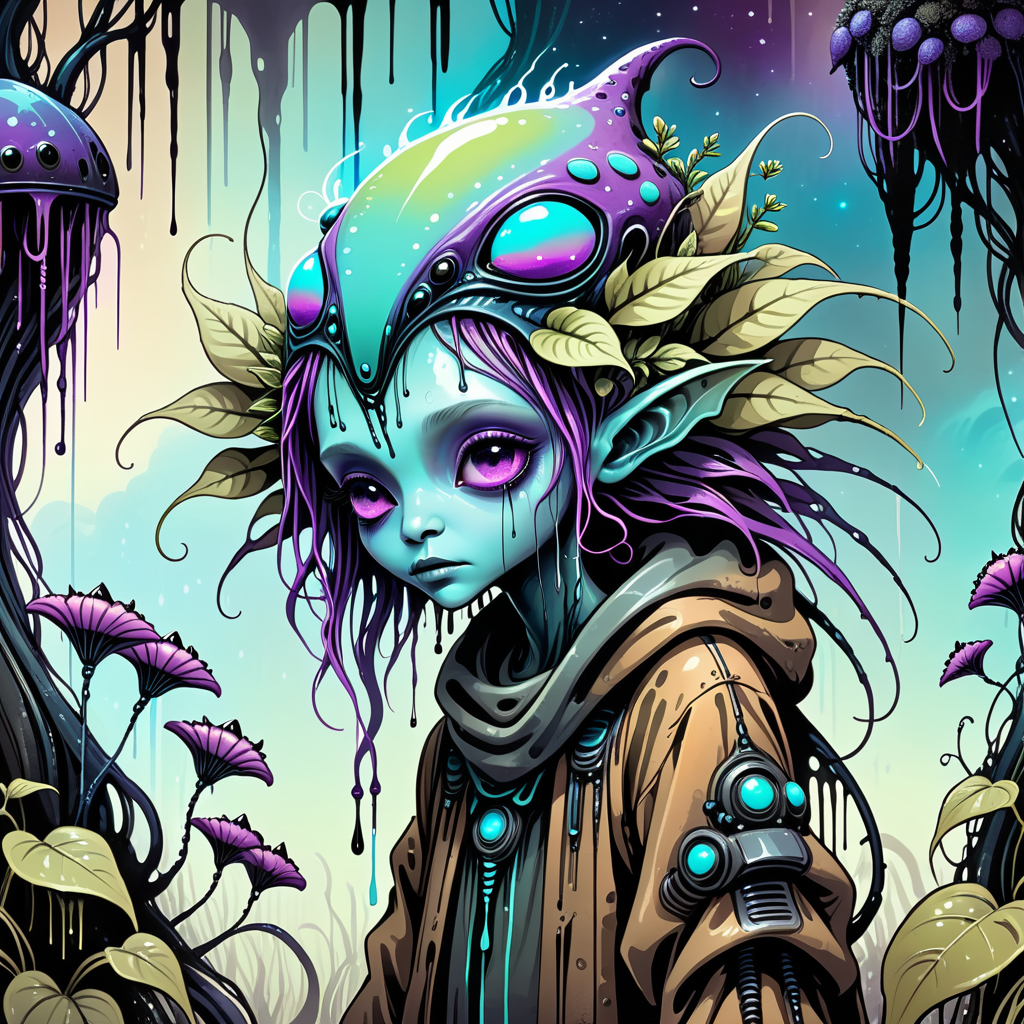 Theme: A mystical, abandoned world blending fantasy and sci-fi, featuring an eerie-yet-cute alien child with glowing eyes, patchwork clothing, and surreal flora. The style combines dark whimsy, watercolor splashes, and surreal gothic fantasy.