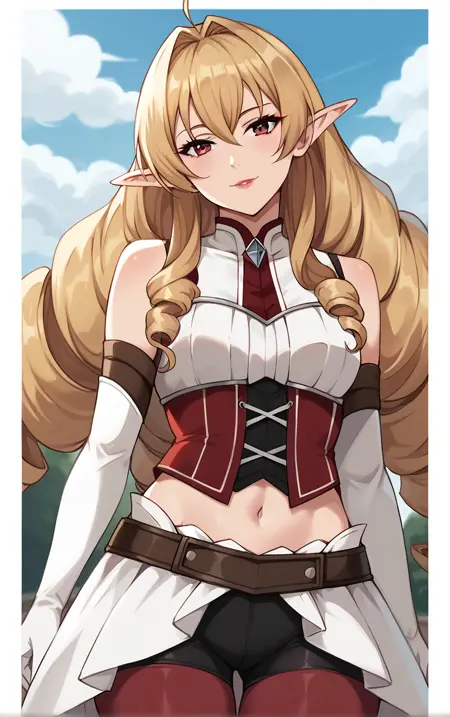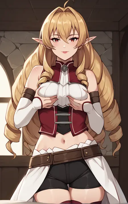 1girl, big hair, blonde hair, drill hair, elf, hair between eyes, long hair, makeup, pointy ears, red eyes, breasts, antenna hair,