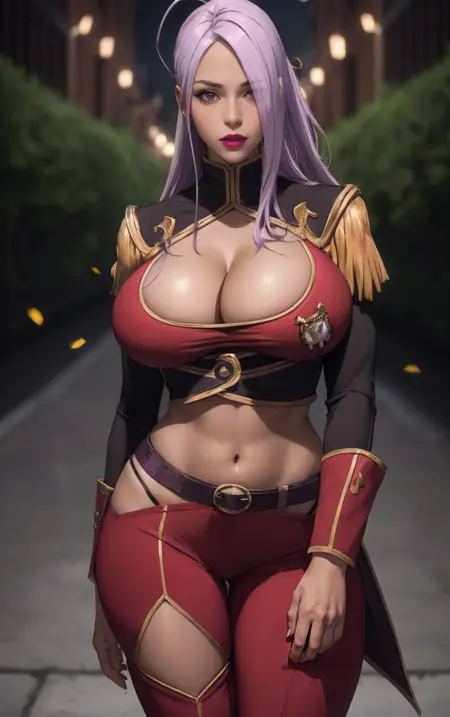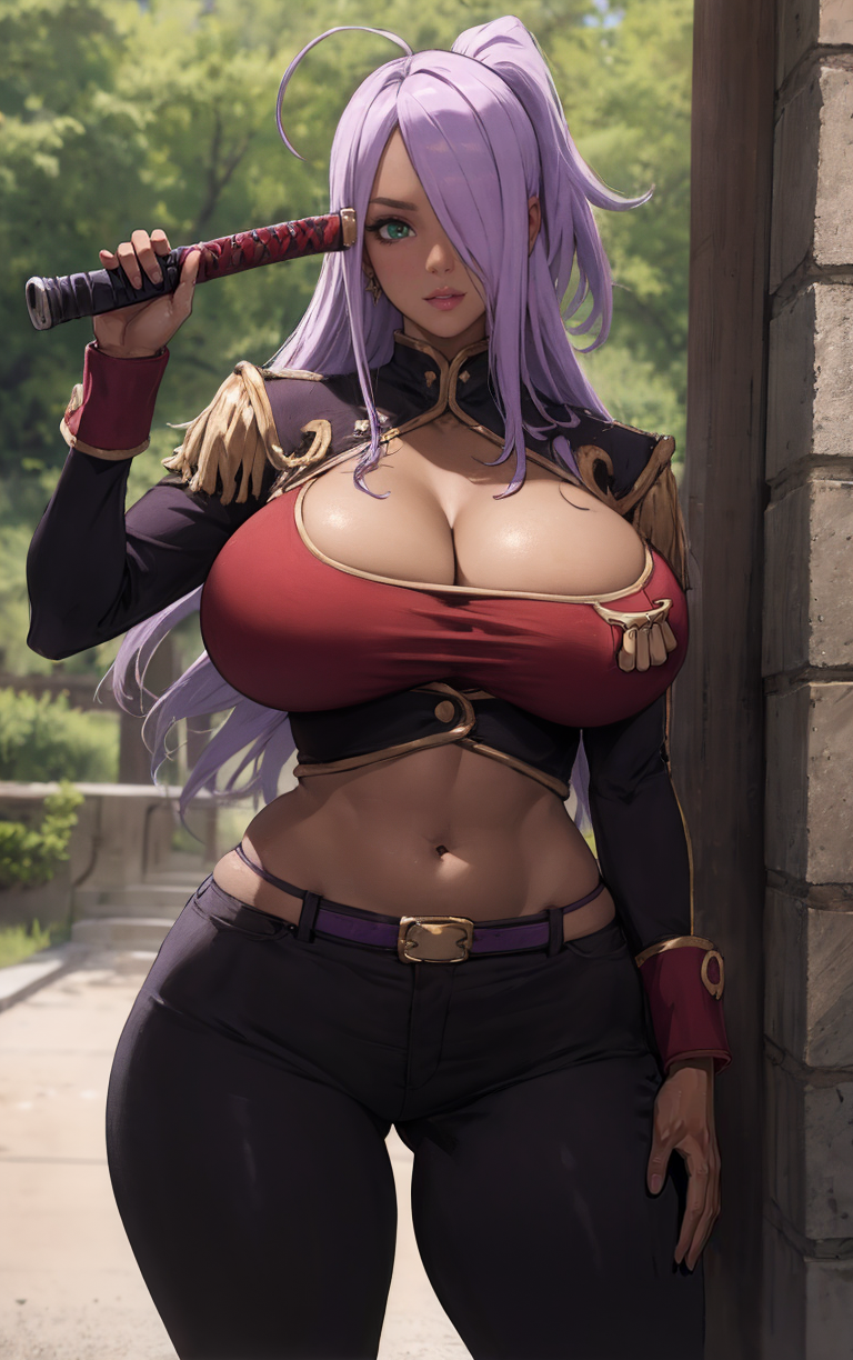 BodySuit_GarnetMclane_ownwaifu, 1girl, long hair, hair over one eye, blue eyes, makeup, purple hair, red lips, very long hair, dark skin, dark-skinned female, huge breasts, lowleg pants, belt, black pants, turtleneck, cleavage cutout, lipstick, clothing cutout, epaulettes, cleavage, midriff, navel, ponytail, thighhighs, crop top, bursting breasts, lips, panties, uniform, armor, lowleg, pants, wide hips, highleg panties, thick thighs, deep skin, thong, aiguillette, katana, long sleeves, sheath,