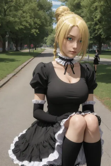 MAIN_Hilda_Beelzebub_ownwaifu, 1girl, blonde hair, lolita fashion, hair over one eye, gothic lolita, green eyes, jewelry, frills, single hair bun, black dress, elbow gloves, necklace, braid, black gloves, single braid, cleavage, maid, long hair, frilled choker, short hair, earrings, collarbone, large breasts, puffy sleeves, neck ribbon, ponytail, ribbon, ribbon choker, black ribbon, goth fashion, kneehighs, pendant, short sleeves, puffy short sleeves, frilled dress, stud earrings, bangs, braided ponytail, frilled gloves,