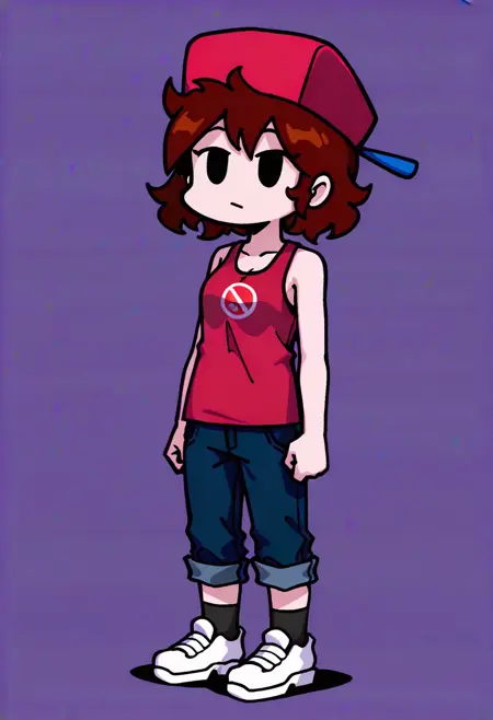RapperGfFNF, 1girl, backward pink-red cap, short messy auburn hair, red tank top with a white no entry sign, short dark blue jeans, short black socks, white sneakers, black eyes, short, no sclera,