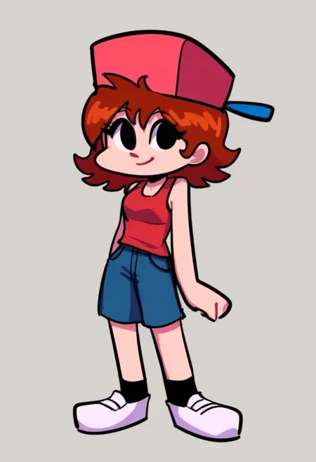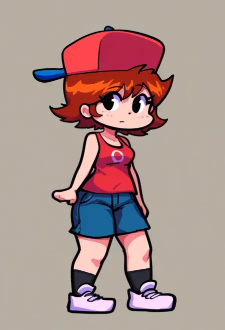 RapperGfFNF, 1girl, backward pink-red cap, short messy auburn hair, red tank top with a white no entry sign, short dark blue jeans, short black socks, white sneakers, black eyes, short, chibi, cartoonish, cartoon style, cartoon, 2d, digital art, 2d art,