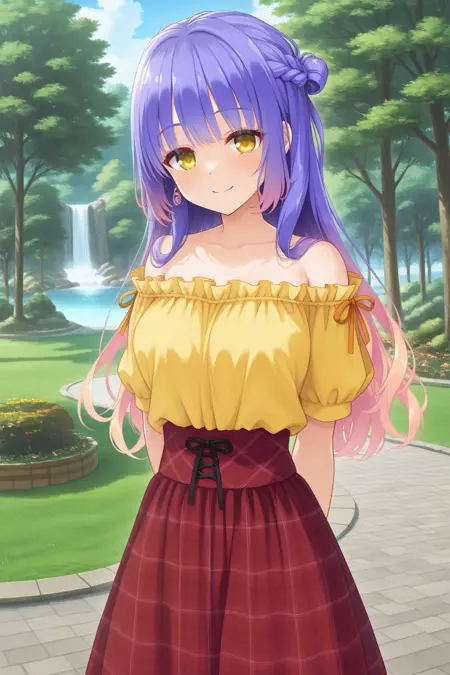bbkurumi, 黄色い目, 紫色の髪, ピンクの髪, 多色の髪, 髪飾り, バンズ, ブレード, 黄色いシャツ, フリル付きシャツ, 赤いスカート, ウエストハイスカート, チェックスカート, フリル付きスカート,
