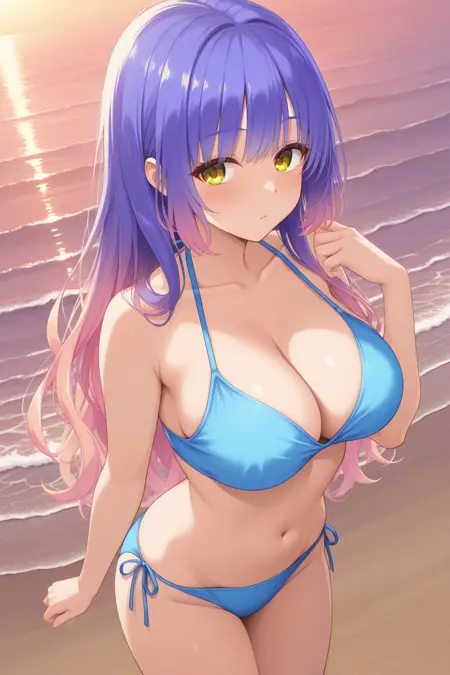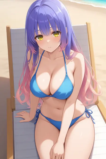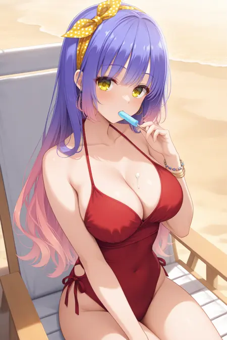 黄色い目, 黄色い目, 紫色の髪, ピンクの髪, 多色の髪, 目の間の髪, 長い髪, グラデーションの髪, 大きな胸, 胸元, クラビックル, 赤いワンピース水着, カジュアルなワンピース水着, ハンター颈, ジュエリー, ブレスレット, 黄色いヘアバンド, 黄色いリボン, 髪のリボン, ピアス, ポカドットリボン,