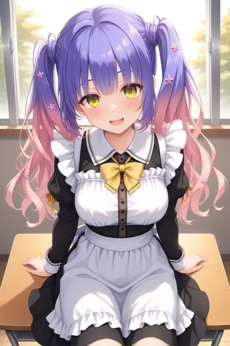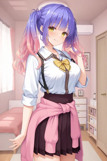 aakurumi, 黄色い目, 紫色の髪, ピンクの髪, 多色の髪, ツインテール, 髪飾り, 学校制服, 白いシャツ, 袖をまくった, サスペンダー, サスペンダースカート, ピンクのセーター, 腰に服が掛かっている, 茶色のスカート, プリーツスカート,