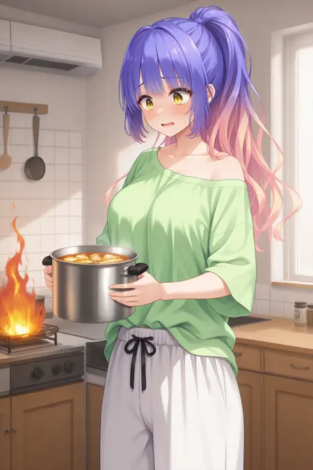 cckurumi, 黄色い目, 紫色の髪, ピンクの髪, 多色の髪, 目の間の髪, 長い髪, 高いポニーテール, ヘアスクラunchie, x 髪飾り, ヘアクリップ, 緑のシャツ, クラビックル, オフショルダー, 短い袖, 片方の肩を露出, 白いズボン,