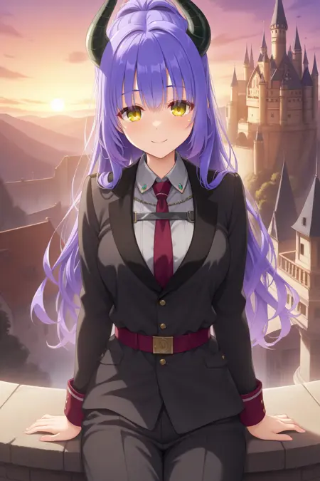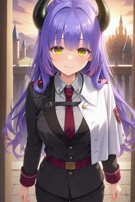 aaslay, 悪魔の角, 紫色の髪, 黄色い目, 髪の間から見える目, 目の間の髪, ユニフォーム, 赤いネクタイ, グレーのシャツ, ポロシャツ, ウィングカラー, 胸ハーネス, 黒いジャケット, 長い袖,