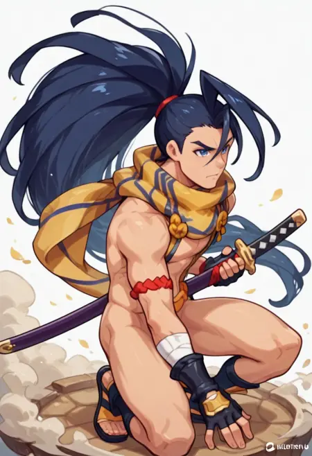musashi, dragalia lost, blue hair, long hair, high ponytail, very long hair, blue eyes, floating hair, scarf, yellow scarf (striped), weapon, sword, katana, japanese clothes, sheath, bird, petals, bandages, cherry blossoms, holding weapon, holding sword, full body, hakama pants, sarashi, high ponytail, hakama, bandaged arm