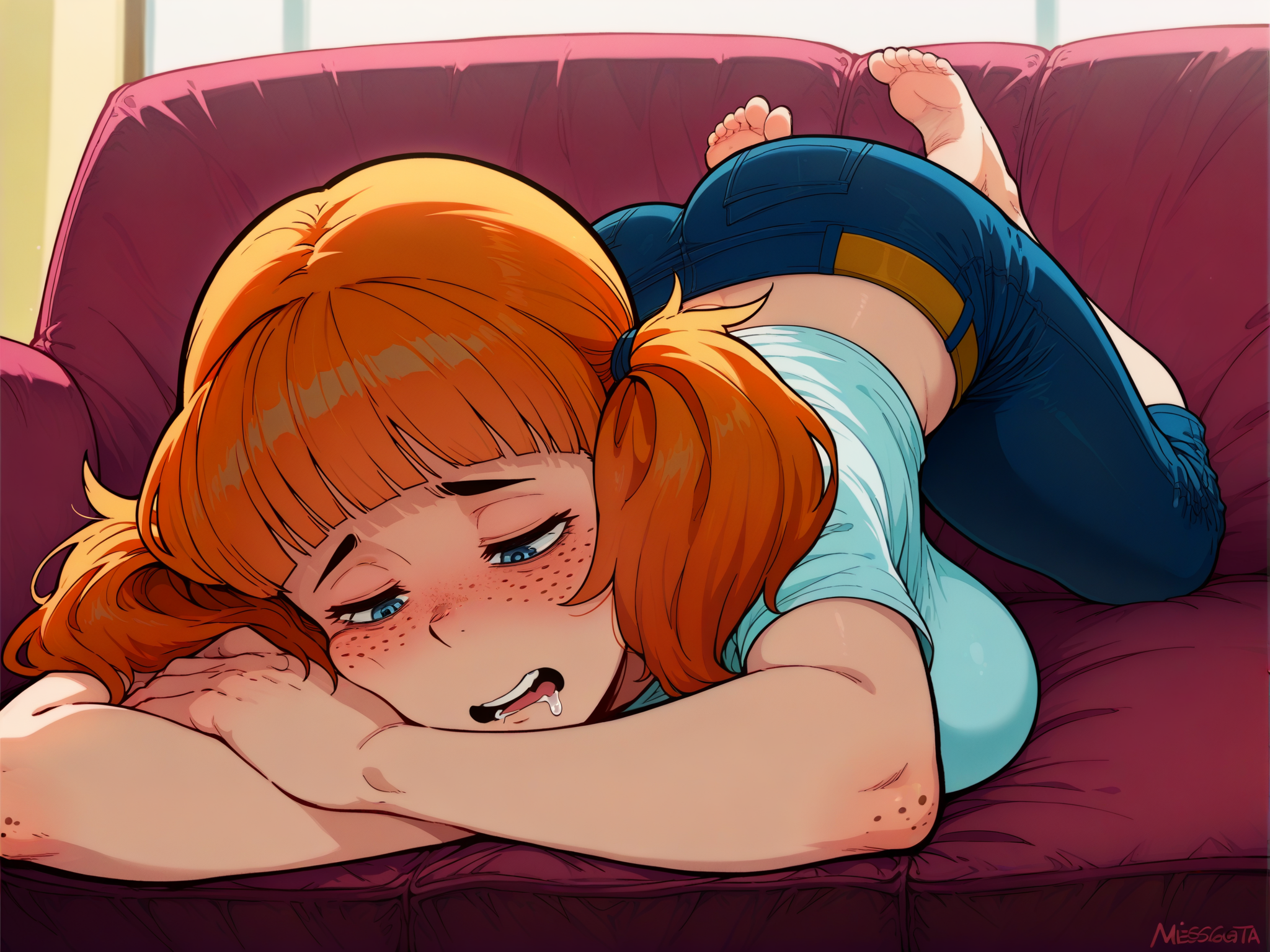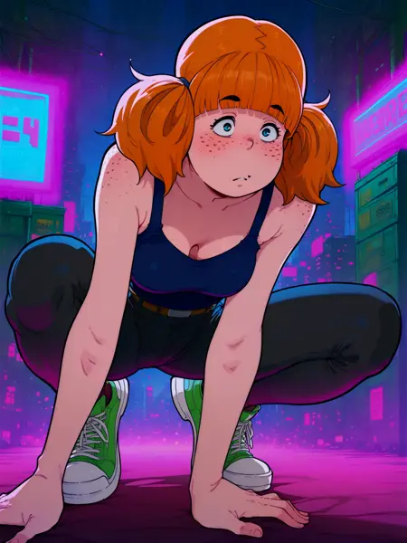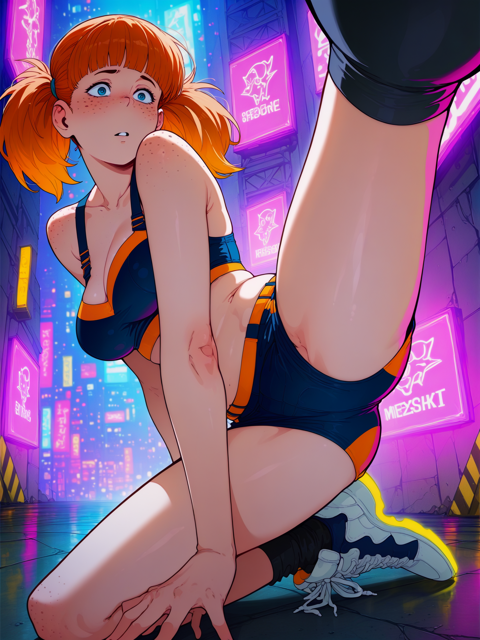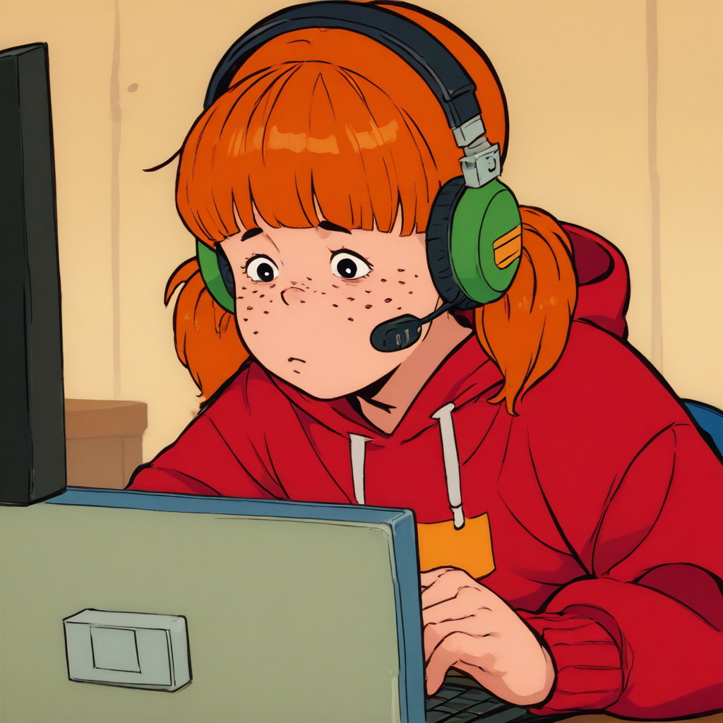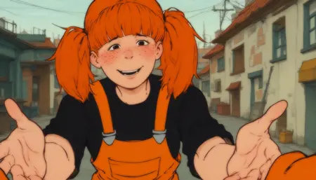 角色标签:mezgakriszta, 1girl, 雀斑, 橙色头发, 刘海, 圆眼, 黑色瞳孔, 短双马尾