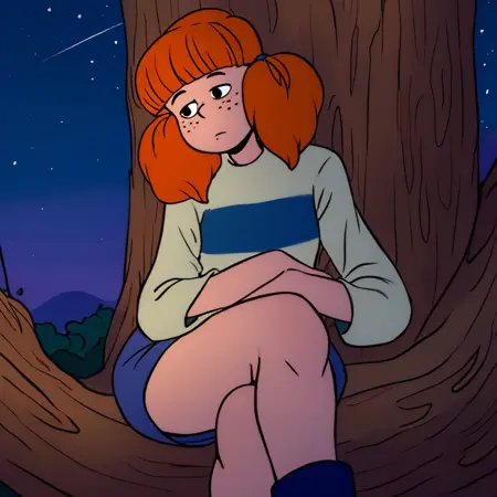 character tags: mezgakriszta, 1girl, freckles, orange hair, bangs, round eyes, black pupils, short twintails