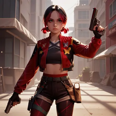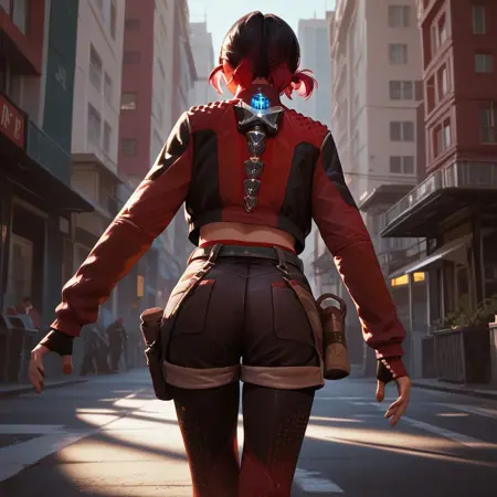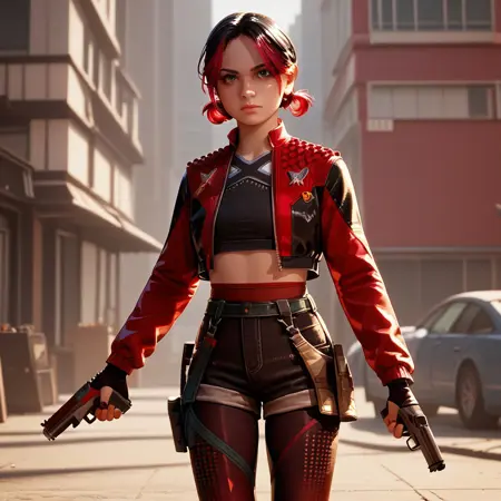 cropped jacket, multicolored hair, black hair, red hair, shorts,