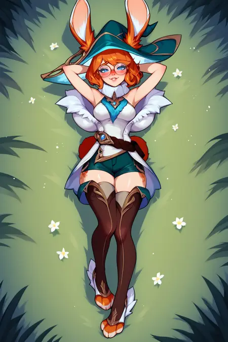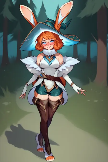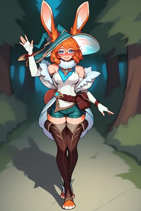 ➜ AuroraLoLPXL, 안경, 파란 눈, 주황색 머리, 단발, 토끼 귀, 동물 귀, 헤어웨어를 통한 귀, 마녀 모자, 토끼 꼬리, 중간 크기 가슴, 어깨 드러냄, 흰색 재킷, 흰색 드레스, 녹색 반바지, 짧은 반바지, 갈색 허벅지 양말, 토끼 발
