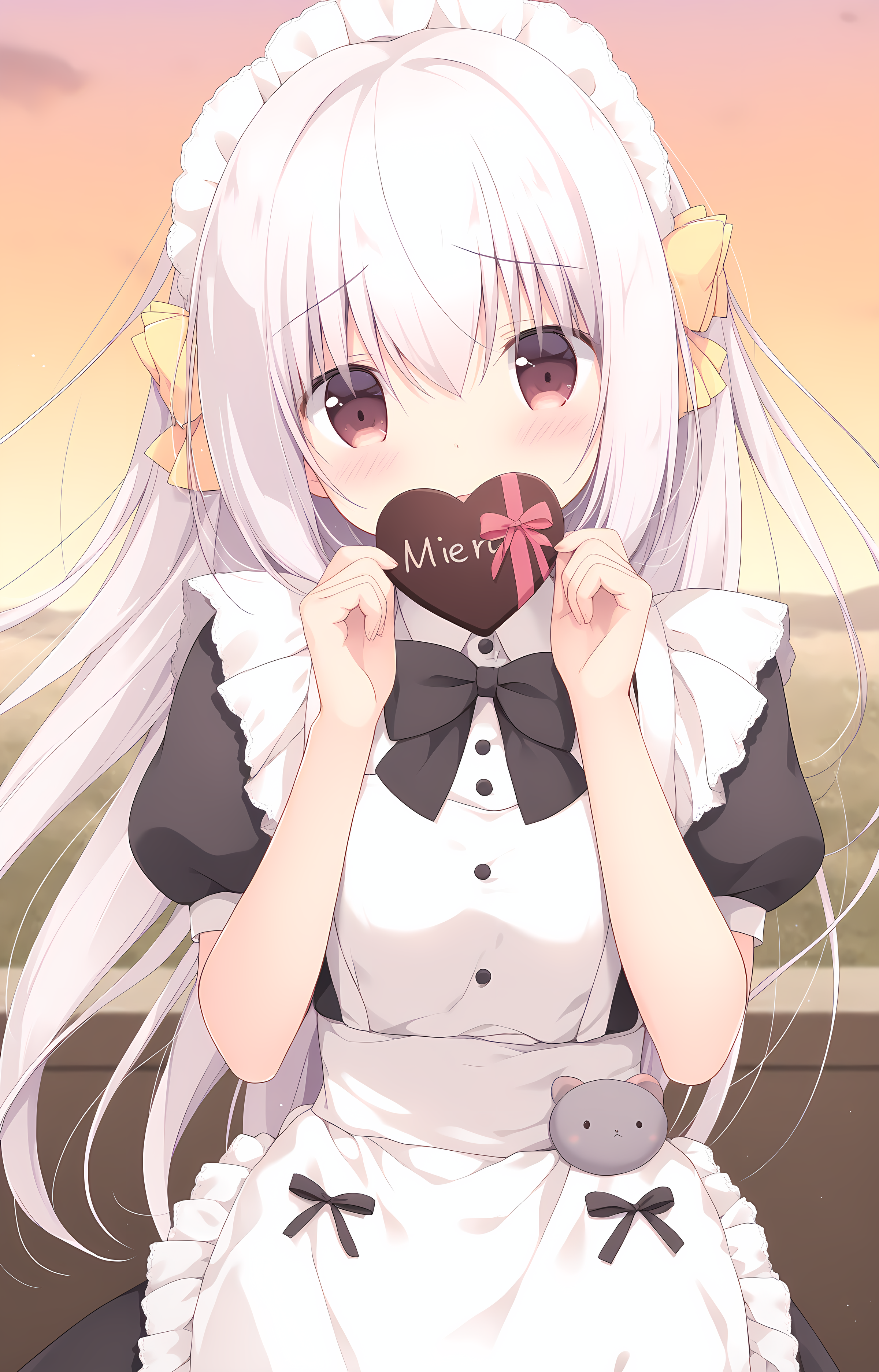 Maid: maid_koron, koron, very_long_hair, white_hair, hair_between_eyes, bangs, two_side_up, hair_bow, yellow_hair_bow, maid_headdress, puffy_short_sleeves, black_bow, collared_dress, buttons, maid_dress, black_maid_dress, white_apron, frilled_apron, frills, maid_outfit, dark_pantyhose, black_shoes, shoes,
