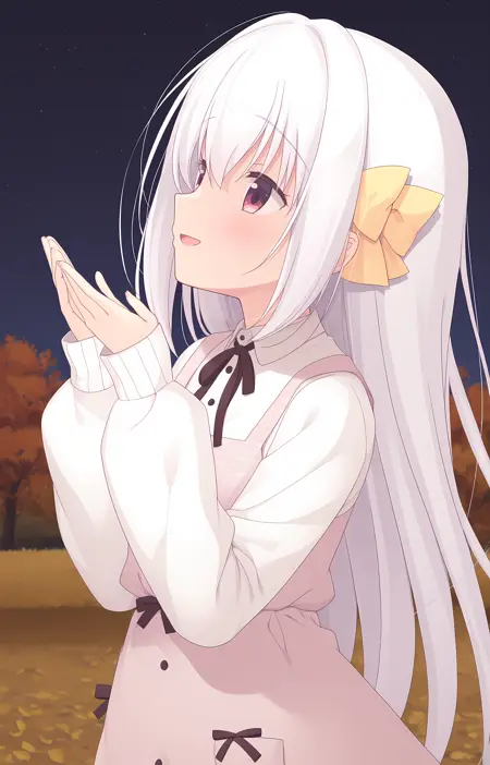 soft dress: soft_dress_koron, koron, very_long_hair, white_hair, hair_between_eyes, bangs, pink_eyes, hair_bow, yellow_hair_bow, short_sleeves, frilled_sleeves, frilled_dress, bow, brown_bow, empire_waist, sleeveless_dress, ribbon, white_dress,