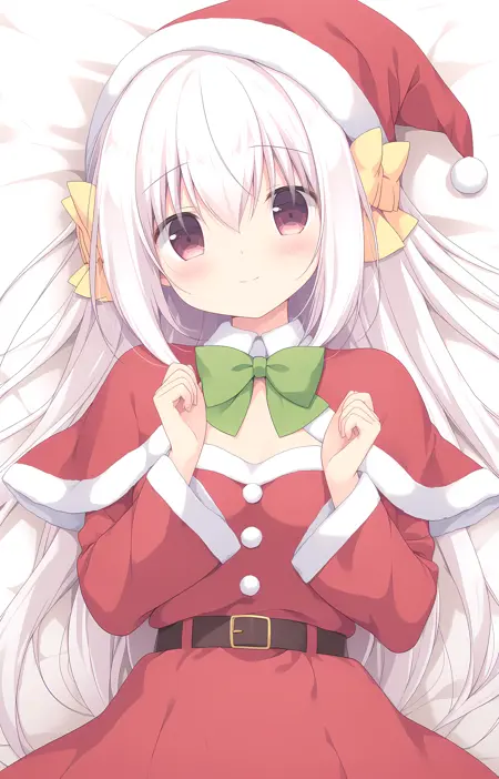 Santa: santa_koron, koron, very_long_hair, white_hair, hair_between_eyes, bangs, pink_eyes, hair_bow, yellow_hair_bow, santa_hat, capelet, red_capelet, fur_trim, bow, green_bow, long_sleeves, santa_outfit, santa_dress, red_dress, fur_trim, belt, belt_buckle, barefoot