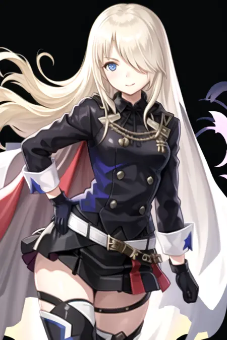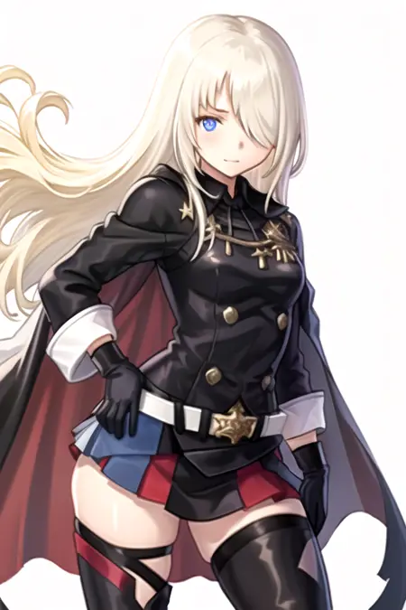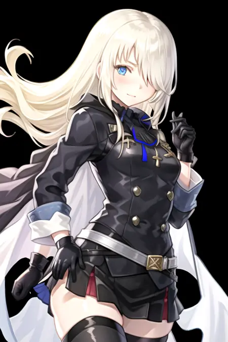 IsukaAlter, 1girl, solo, long hair, blue eyes, skirt, blonde hair, thighhighs, gloves, long sleeves, jacket, black gloves, belt, cape, hair over one eye,
