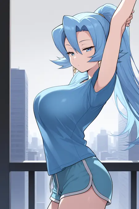 • 想要她的普通外观,请添加:"pmc1r, 蓝色头发, 高马尾, 长发, 发丝遮眼, 蓝色眼睛, 大胸部, 耳环, 黑色项圈, 蓝色紧身衣, 无袖紧身衣, 双色紧身衣, 蓝色短裤, 黑色斗篷, 蓝色手套, 蓝色靴子"