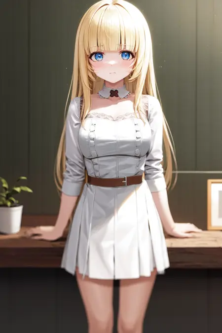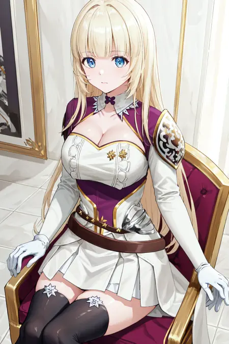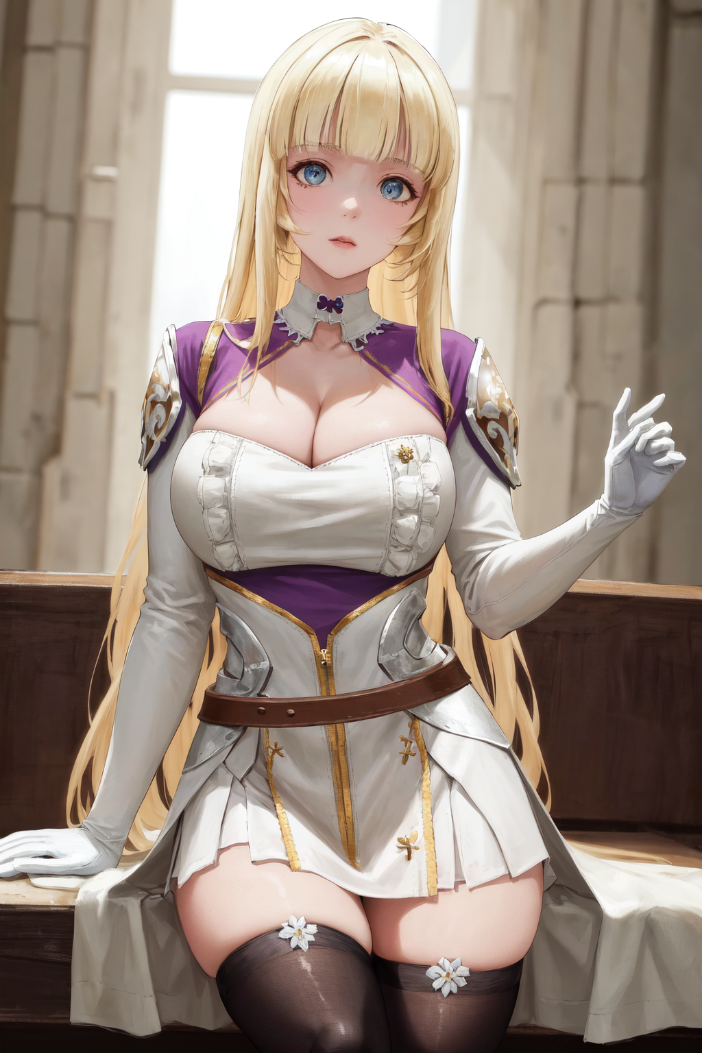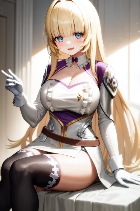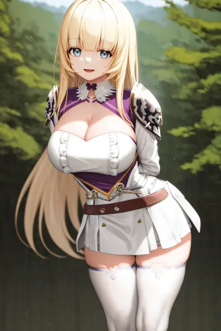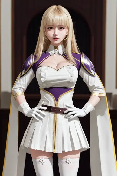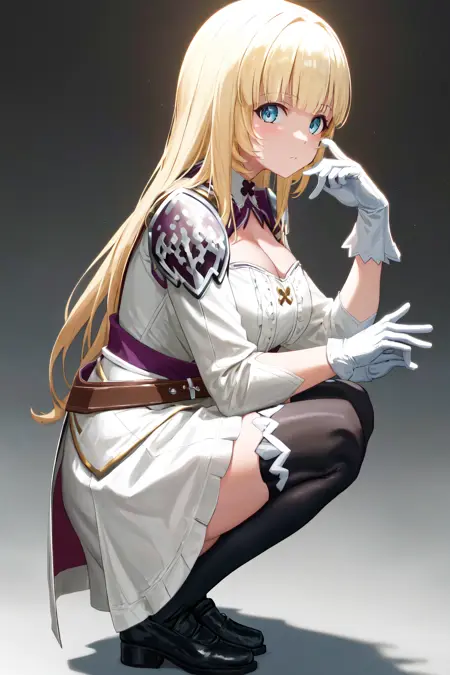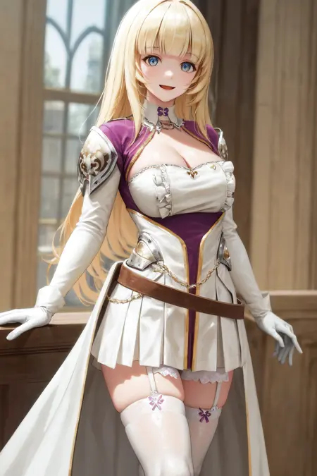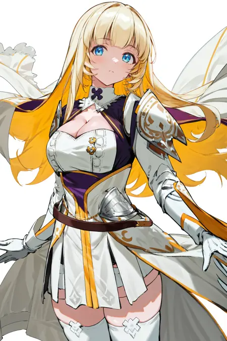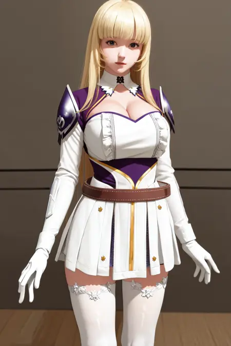 默认服装:露胸剪裁的黑色过膝袜、白色短裙、白色连衣裙、白色腰带、白色手套、带鞘肩甲