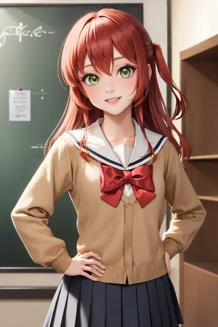Default Outfit: school uniform, brown serafuku, sailor collar, bow, long sleeves, black skirt, pleated skirt