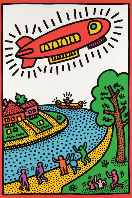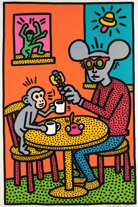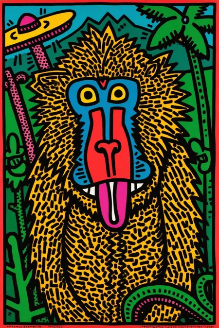 Trained on 23 illustrations/posters by the American pop art artist Keith Allen Haring (May 4, 1958 โ February 16, 1990). To see his works, please go to https://artsandculture.google.com/entity/keith-haring/m01sl6w