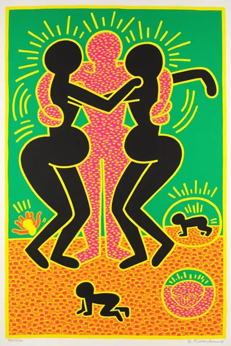 キース・アレン・ハリング(1958年5月4日 – 1990年2月16日)は、ストリートカルチャー、ポップアート、政治的活動を融合した、大胆で色彩豊かでエネルギッシュな作品で知られるアメリカのアーティストで社会活動家です。彼の作品に登場する光る赤ん坊、吠える犬、踊る人物、抽象的なシンボルは、20世紀後半で最も識別しやすいビジュアルスタイルのひとつとなりました。