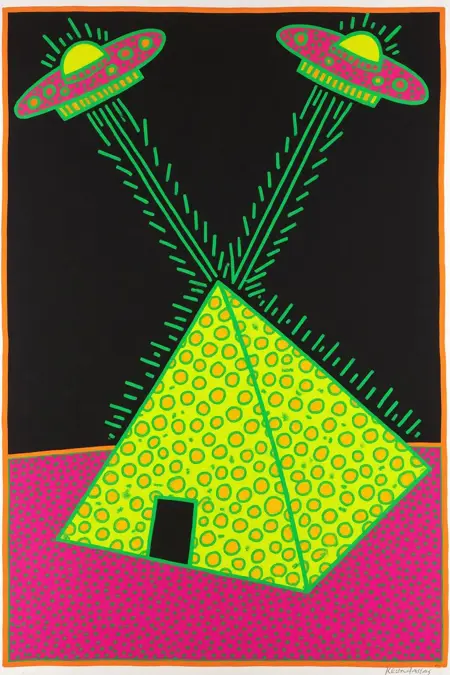 ๐น Developed his signature motifs: radiant babies ๐ถ, barking dogs ๐, UFOs ๐ธ, and dancing figures ๐.