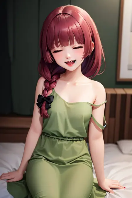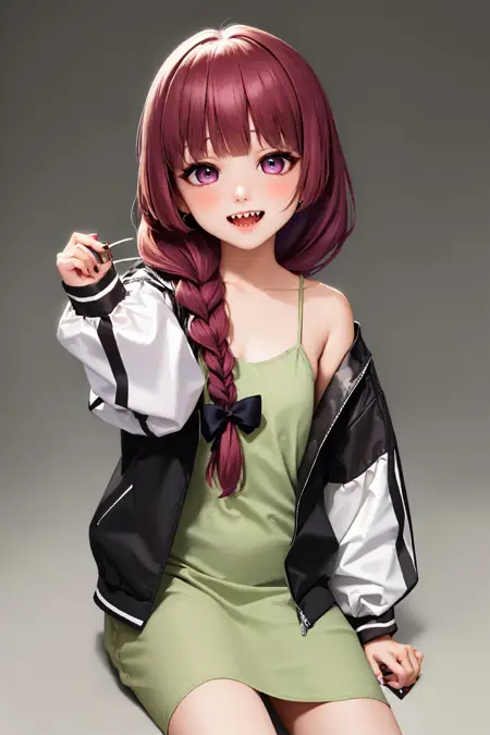 トリガー+外見: hiroi kikuri, 尖った歯, まっすぐな前髪, ショートの編み込み, 肩まで落ちる髪, 髪飾り