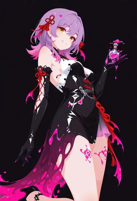 1girl, fraink, yellow eyes, medium hair, purple hair, dress, black dress, white top, black latex gloves, asymmetrical skirt with pink gradient, black high heels, thigh tattoo, holding a potion, mysterious expression, black, intricate floral accessories,