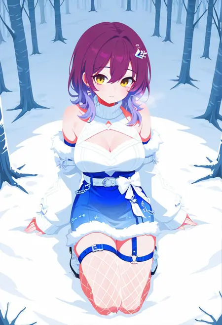 1girl, frasnw, medium hair, purple hair, yellow eyes, halter dress, white dress, cleavage cutout, alt halterneck, turtleneck, alt high-waist skirt, fur-trimmed skirt, blue skirt, white bow, winter clothes, detached sleeves, fur-trimmed sleeves, white sleeves, long sleeves, sleeves past wrists, blue thigh strap, fishnets, fishnet thighhighs,
