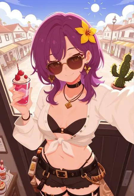 1girl, fradsrt, medium hair, purple hair, sunglasses, white shirt, tied shirt, long sleeves, bandeau bra, black bra, alt black choker, necklace, earrings, alt hair flower, yellow flower, black shorts, short shorts, black belt, loose belt, panty straps, thigh strap