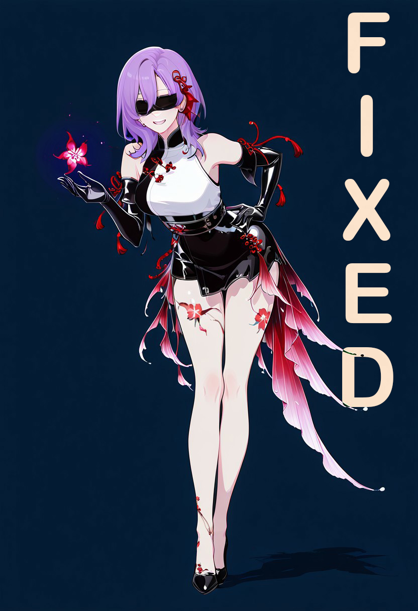 1girl, fradef, covered eyes, black dress, short dress, lack choker, halterneck, shoulder straps, bare shoulders, white coat, coat, detached sleeves, short puffy sleeves, white sleeves, black gloves, black arm warmers, thigh pouch,