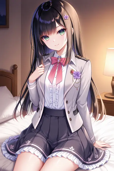 ensemble style, sumire(ensemble), 1girl, 녹색 눈, 검정색 머리, 긴 머리, 보라색 꽃 헤어핀, 앞머리,