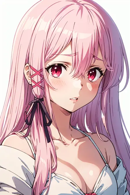 For her original outfit use the tags: pikkykisara, 1girl, solo, looking at viewer, pink hair, long hair, hair between eyes, bangs, red eyes, breasts, small breasts, ribbon, hair ribbon, school uniform, red bow, white sailor collar, bow, long sleeves, sailor collar, juliet sleeves, puffy sleeves, bowtie, red bowtie, skirt