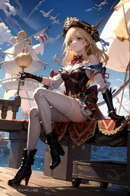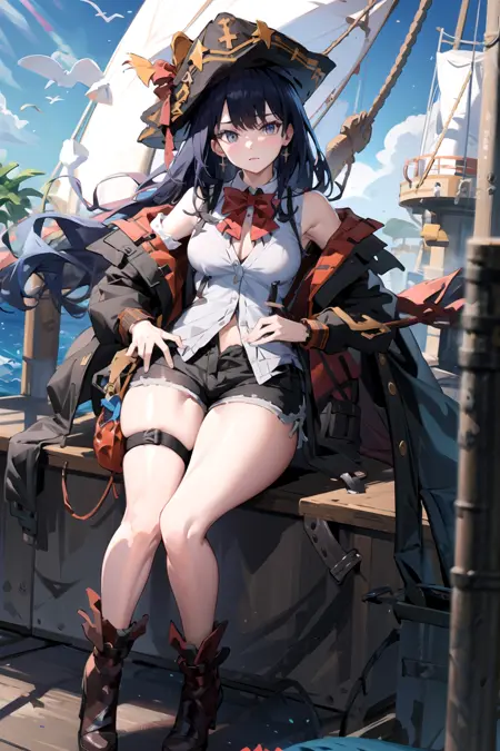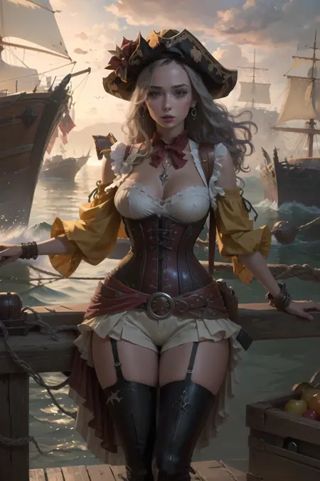 gun, hat, holding gun, holding hat, antique firearm, water, crate, parrot, treasure chest, eyepatch, fingerless gloves, gloves, thighhighs, boots, cleavage, thigh boots, jewelry, earrings, fur trim, pelvic curtain, shorts, hat, jacket on shoulders, pants, pirate hat, jacket, coat, coat on shoulders, long sleeves, shirt, frills, knee boots, cross-laced footwear, necklace, leather pants, tight pants, wide sleeves, skirt, garter straps, bowtie, dress, bustier, shrug (clothing), high-waist shorts, pantyhose, pantyhose under shorts, collared shirt, cape, high heel boots, torn thighhighs, torn pants, lace-up boots, skull and crossbones, one eye covered, corset - 데이터셋에서 일반적으로 등장한 옷과 아이디어들의 조합입니다.
