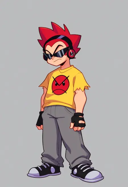 PicoFulpFNF, 1boy, light skin, spiky and turned back red hair, dark gray headphones, pointy black sunglasses, yellow shirt, ripped sleeves, gray biker fingerless gloves, gray pants, black sneakers, cartoonish, cartoon style, cartoon, 2d, digital art, 2d art