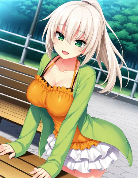 outfit02,开衫,绿色开衫,敞开式服装,敞开式开衫,长袖,袖子超过手腕,吊带背心,橙色吊带背心,荷叶边吊带背心,无袖背心,黑色无袖背心,锁骨,裙子,白色裙子,层叠裙子,花边裙子,